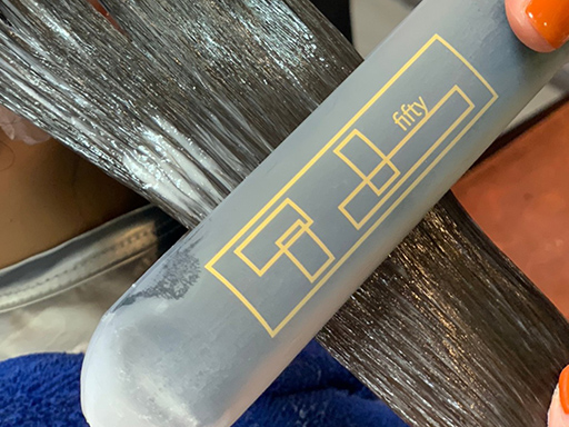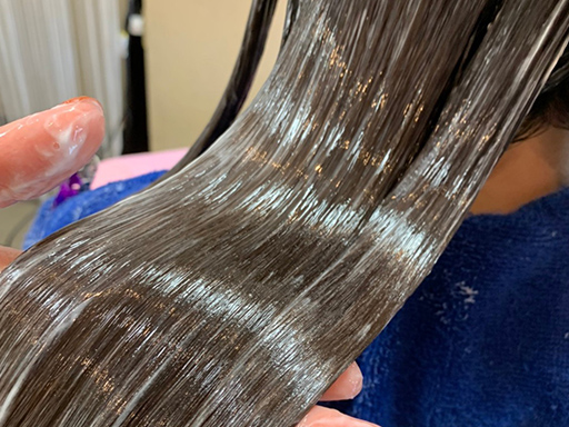 クリームを髪の毛の中に溶かし込むように、電解質のウォーターをもう一度しみ込ませていきます。髪の毛のやわらかさ・もっちり感がアップしていきます!